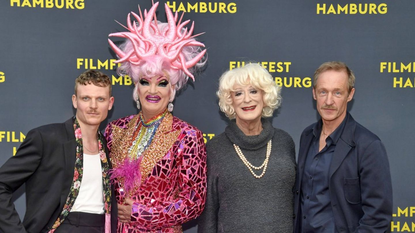 Natürlich waren auch die weiteren Stars der ZDF-Produktion, die von Jones‘ Jugend bis hin zum Aufstieg in der schillernden Hamburger Dragszene handelt, vor Ort. Auf Fotos von der Veranstaltung posiert Jones gemeinsam mit „Olivia“-Regisseur Till Endemann und den beiden Schauspielern, die sie in dem Streifen verkörpern: Die erwachsene Version wird im Film von Johannes Hegemann gespielt, der 13-jährige Arian Wegener mimt derweil den jungen Oliver Knöbel, wie die Travestie-Kultfigur mit bürgerlichem Namen heißt.